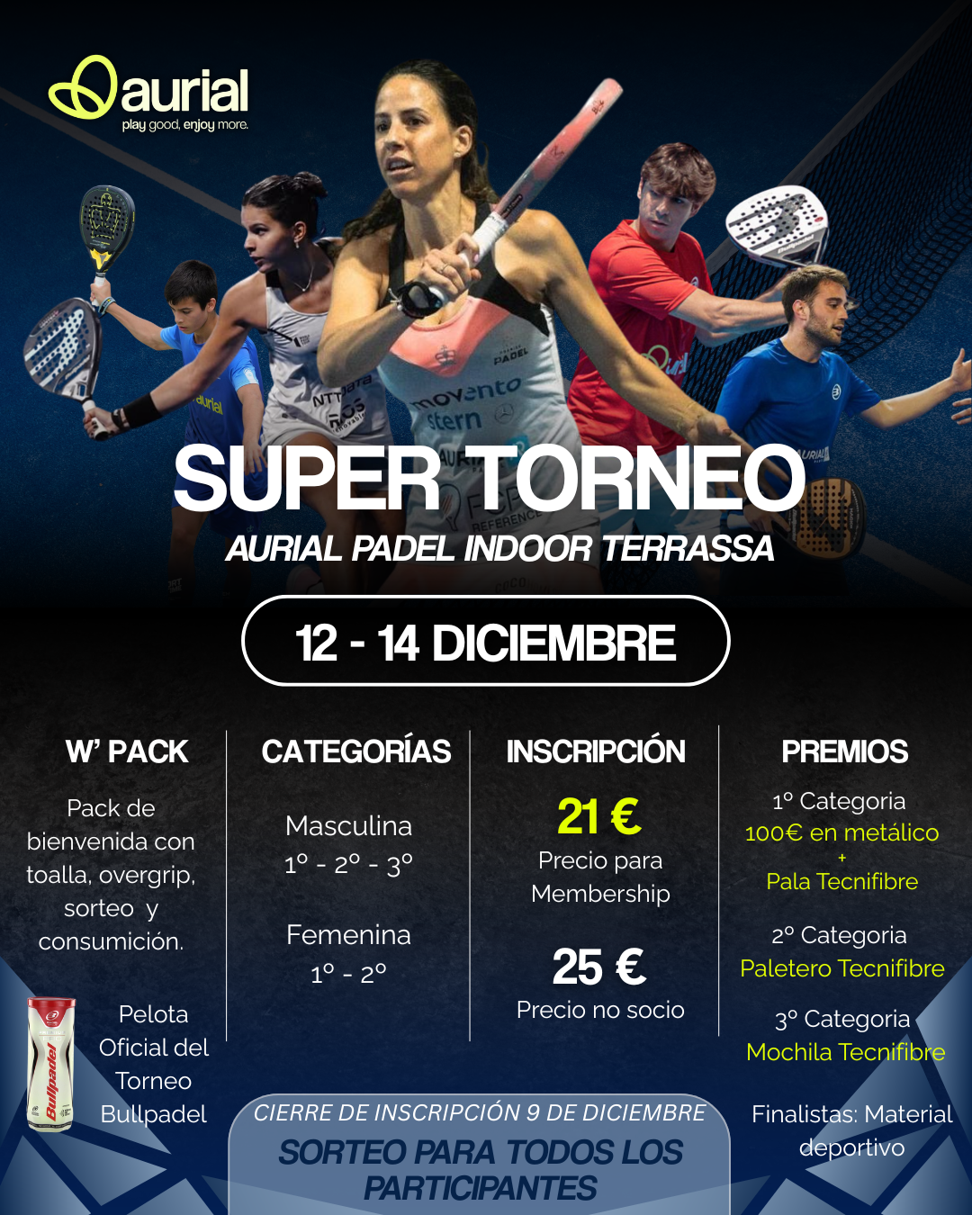 SUPER TORNEO 🚀 Aurial Padel Indoor Terrassa ¡Llega el gran torneo de final de año a Aurial Padel Indoor Terrassa! Del 12 al 14 de Diciembre, te...