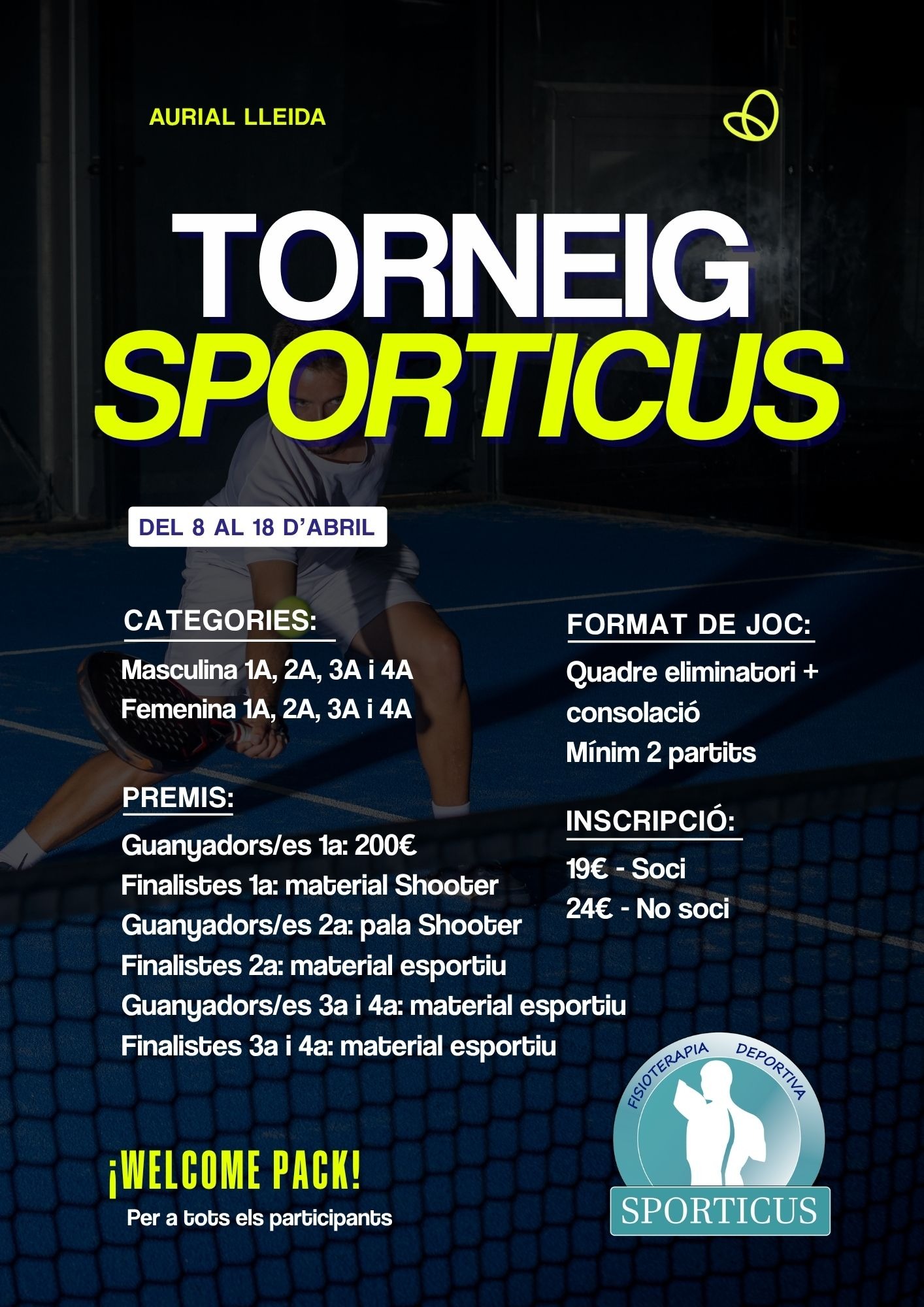 TORNEIG SPORTICUS Del 8 al 18 d'Abril Tardes i caps de setmana Categories: Masculina i Femenina - 1A, 2A, 3A i 4A WELCOME PACK per a ...